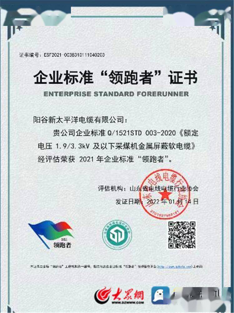 2021年度阳谷县山东日辉电缆集团有限公司、山东钱柜qg777集团有限公司、等5家企业的8项企业标准荣获企业标准“领跑者”证书,获批数量居全市第一位。